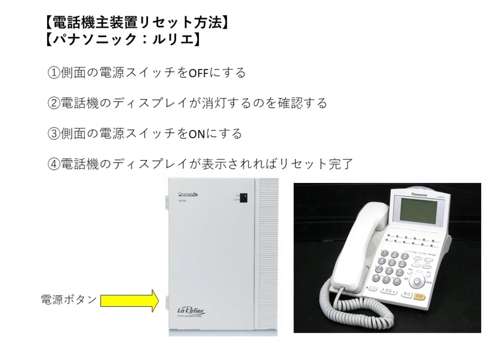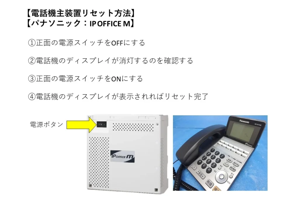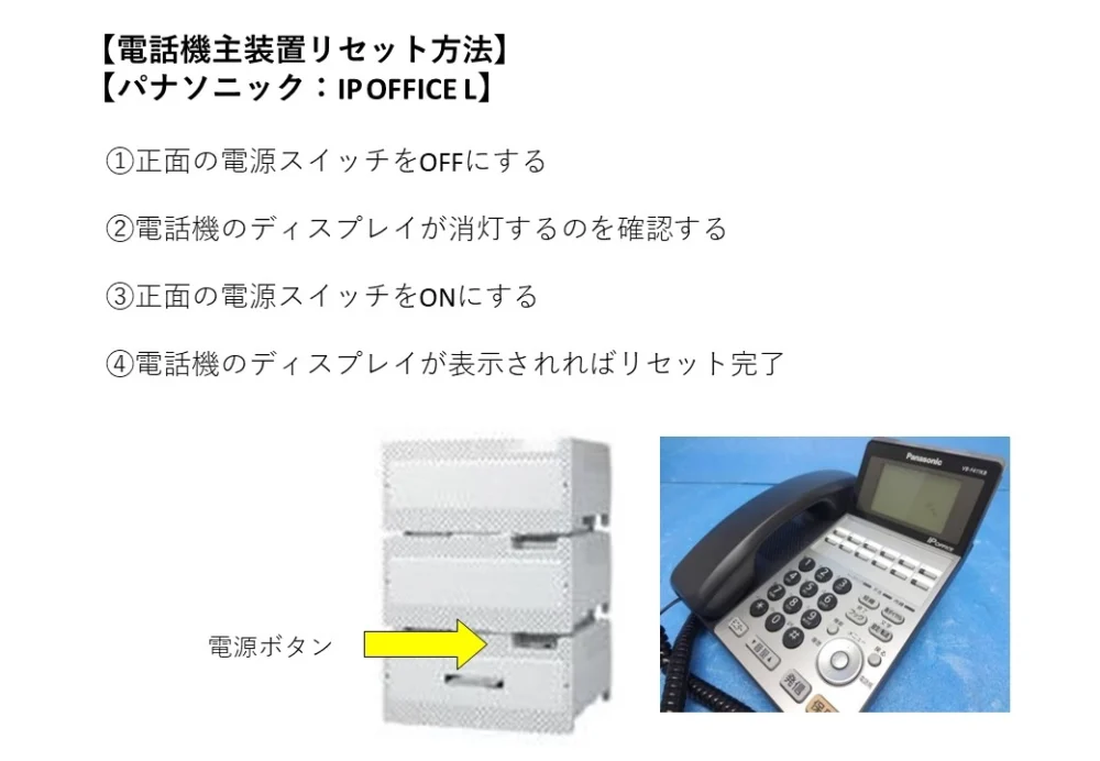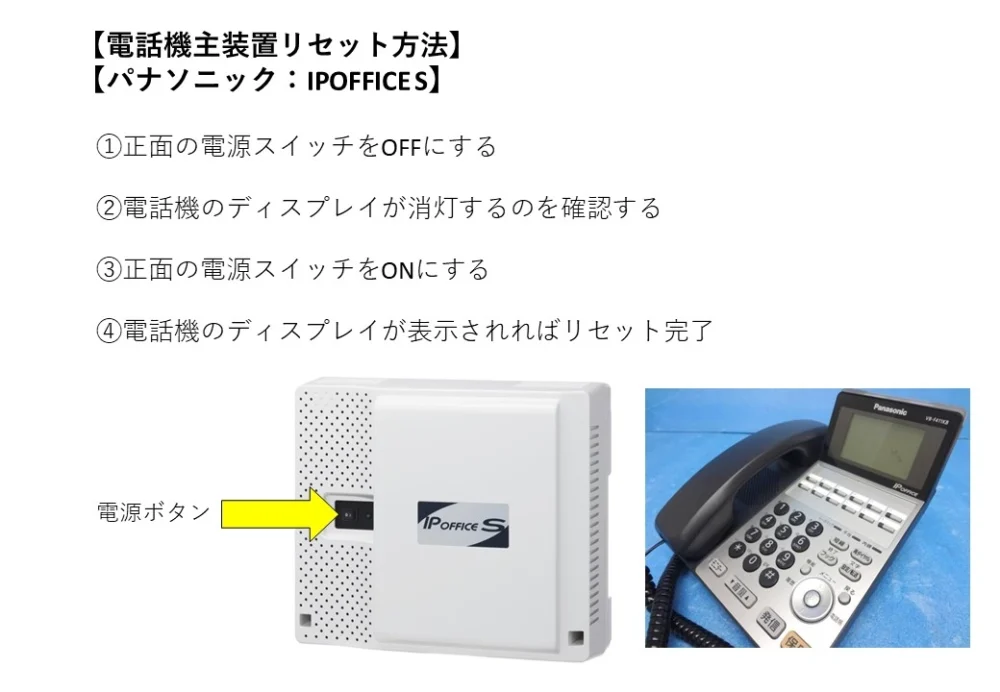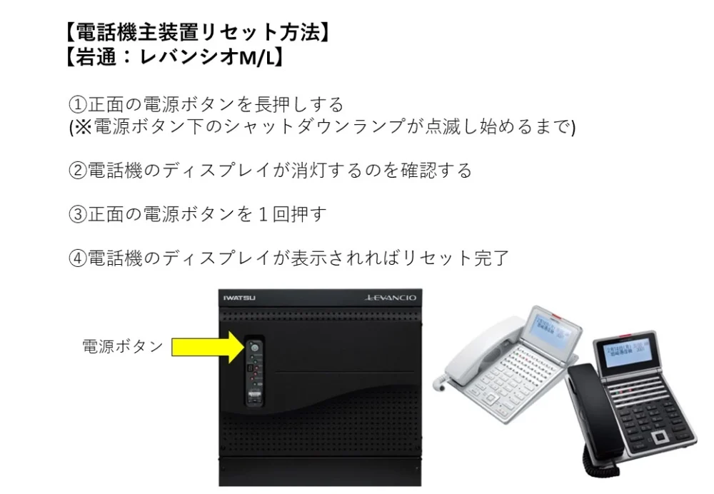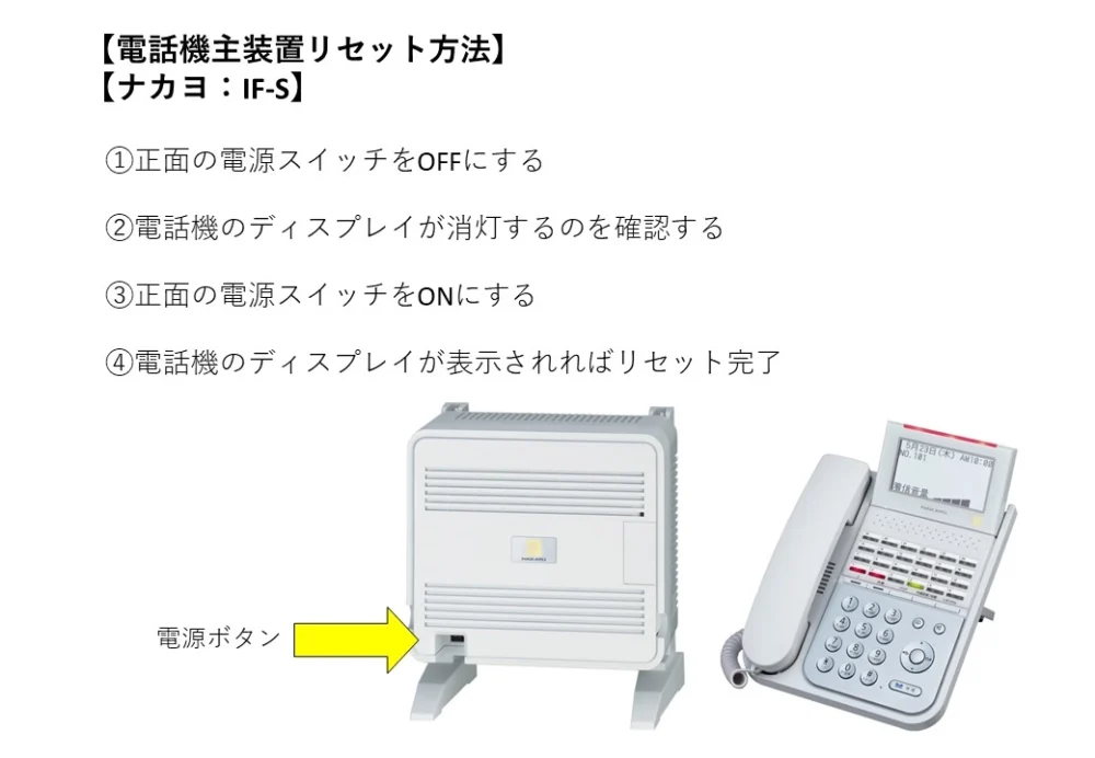 ※再起動の方法についてはこちらをご確認下さい。外線のみの場合で主装置の再起動で改善しない場合がNTT(電話加入会社)へ回線の調査をお願いします。(NTT異常の場合はNTT側が対応します)